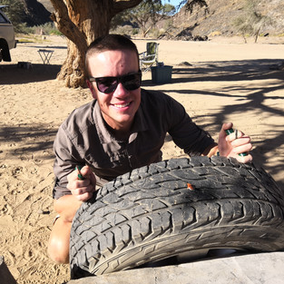 Nach ca. zwei stündiger Fahrt sagte ich: "da riecht es aber nach Essen, wer kocht denn da?". Es war das Tupperware mit dem Rest Cape Malay Curry vom Vorabend, das durch das Geschüttel langsam den Weg ins Auto fand. Es wurde also Zeit für einen Mittagshalt. In einem trockenen Flussbett im Schatten eines vertrockneten Baumes hielten wir an. Als ich ausstieg hörte ich ein leises "pfffff" und rief Basti auf meine Seite. Verdammt... hinten links hatten wir ein kleines Loch im Pneu. Kein Mittagshalt, sondern weiterfahren. Da wir nur langsam Luft verloren, konnten wir den Pneu alle 15-20 Minuten wieder auf ca. 1.5-2 bar aufpumpen und weiterfahren. Für einen Reifenwechsel waren wir zu faul und bei diesem Untergrund wäre dies auch nicht ohne Risiko gewesen. Somit wurde unser Weg noch zusätzlich erschwert. Extrem steil rauf, extrem steil wieder runter, anhalten, aufpumpen und weiterfahren für die nächsten zwei Stunden. Als wir endlich das Flussbett des Ugab Flusses erreicht hatten, mussten wir diesen noch ca. 15 km hinauf fahren, um zum Campingplatz zu gelangen. Nach über vier Stunden kamen wir völlig erschöpft an und gönnten uns erst mal ein Bier.